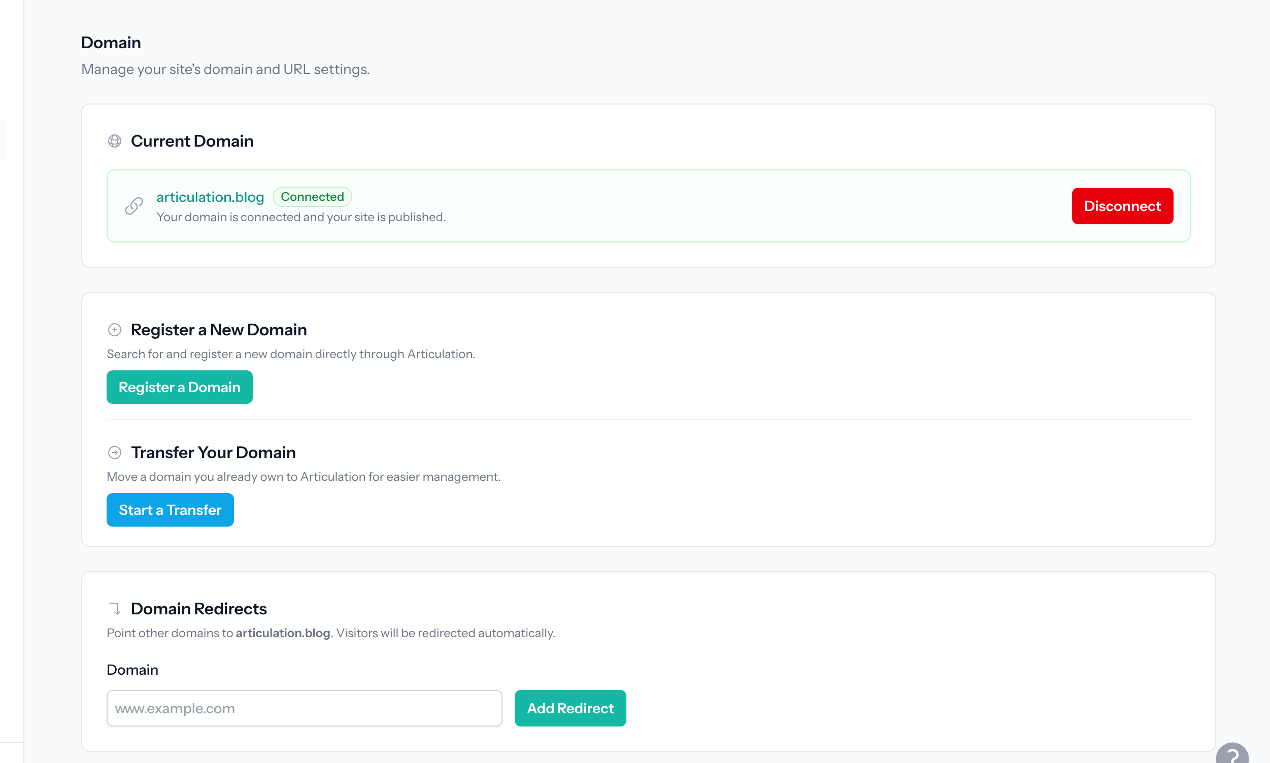 Head to your site's Domain settings to search for a domain or start a transfer. If you already have a domain elsewhere and want to keep it there, you can still connect it to your Articulation site with our existing DNS connection flow.